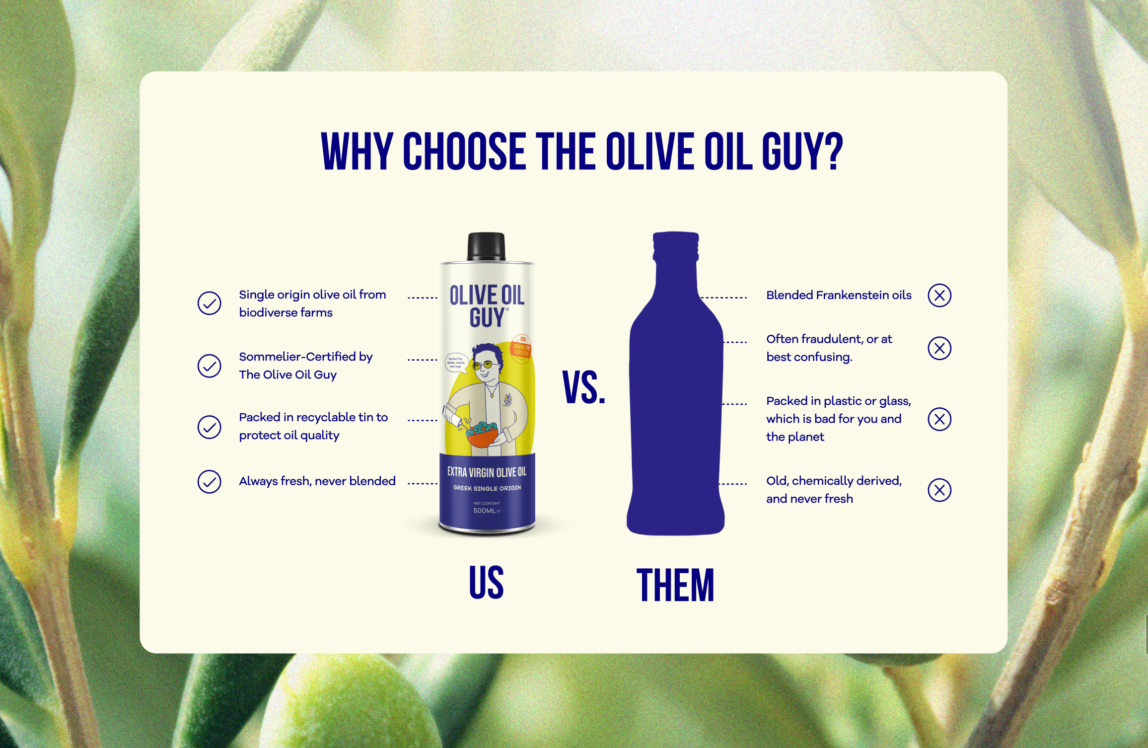 Three bottles of Olive Oil Guy olive oil with vegetables on a blue background